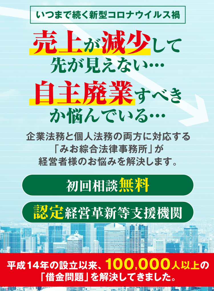正しい知識と豊富な経験がないと、知らずに破産・清算に関する法律を破ってしまい、スムーズに事業をたためなくなる場合があります。数多くの会社の破産・清算をサポートしてきた「みお」の弁護士なら、取り返しのつかないトラブルを回避できます。