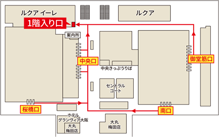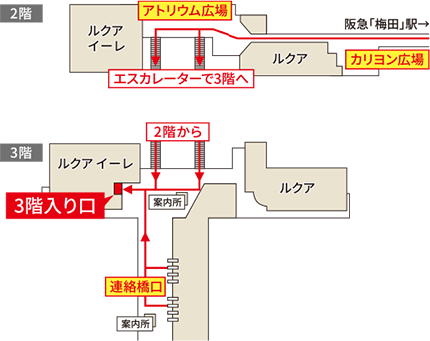 JR「大阪」駅方面へ進み、ルクア館内または連絡通路を通過して「アトリウム広場」へ行き、エスカレータより3階へ。JR大阪三越伊勢丹入口の左にあるノースゲートビル オフィスタワー入口よりお進みください。