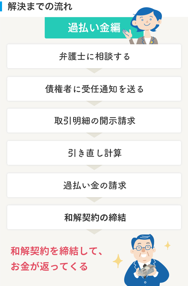 取引明細を見て、利息制限法の上限利率で、利息を計算し直します。これで、過払い金がいくらになるのかが、わかります。債権者に過払い金の支払いを請求します。返還の時期、金額などについて、互いに折り合いがついたら、和解契約を締結。過払い金が支払われます。