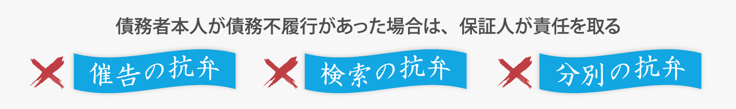 債務者本人が債権者に対して債務不履行があった場合は、保証人が責任を取ることになります。保証人というのは通常「連帯保証人」のことなのですが、連帯保証の場合は、債務者本人と全く同じ責任を負います。「私が借りたわけではないから、まずは債務者本人に請求してくれ」(催告の抗弁)も、「債務者本人は会社勤めで給料をもらっているから、まずは、給料を差し押さえてそっちから回収してくれ」(検索の抗弁)も、「保証人が2人いるから半分だけにしてくれ」(分別の抗弁)もありません。