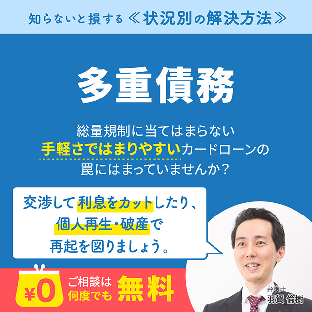 高金利での貸付けや悪質な取立てが社会問題になったことを受けて、2010年、総量規制とよばれる法律が施行され、年収の3分の1を超える借金はできなくなりました。これで多重債務者の数はぐんと減るはずだったのに、最近また多重債務に苦しむ人がふえてきているといいます。その原因とされるのが、Mさんが利用した銀行カードローンです。というのも、総量規制が対象とするのは消費者金融や信販会社であり、その中に銀行は含まれていないのです。